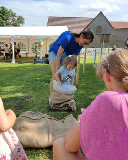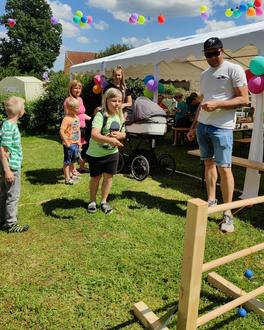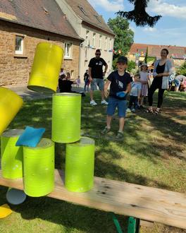 Auch die Mitmach-Olympiade zog wieder viele Kinder auf den oberen Anger. Dort waren die Stationen Sandgraben, Balancieren, Dosenwerfen, Torwandschießen, Leitergolf, Lochwerfen, Eierlauf und Sackhüpfen aufgebaut. Für jede absolvierte Disziplin gab es einen Stempel und am Ende eine Überraschungstüte mit unter anderem einem selbst gehäkelten Schlüsselanhänger.