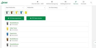 Sie haben ein internetfähiges Endgerät? Dann finden Sie auf www.awsas.de ebenso alle Tourendaten griffbereit. Folgen Sie auf der Startseite einfach dem Schnellzugriff „Tourenplan“. Wählen Sie zwischen verschiedenen Ausgabemöglichkeiten: Ein kompaktes „Blatt“ im pdf-Format mit allen Jahresterminen - perfekt zum Aushängen im Hausflur oder an die eigene Pinnwand. Oder Sie laden die Entsorgungstermine als Kalenderdatei (ics-Datei) in den eigenen digitalen Kalender.