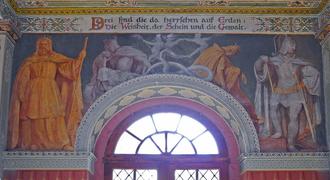 Obwohl wir immer vom Freskensaal sprechen, handelt es sich wohl beim genannten Wandbild um kein Fresko, sondern ein Secco, also ein auf den abgebundenen Putz aufgetragenes Bild mit Leimfarben. In der Handlung des Märchens steht der goldene König (links) für die Weisheit, der silberne König mit Zepter und Schwert (rechts) für den Schein und der noch sitzende, aber im Aufstehen begriffene eherne König, der sich auf die Keule stützt, für die Gewalt. Der vierte König besteht aus allen drei, allerdings inhomogen verteilten Metallen. Während der eherne König aufsteht, bricht der sitzende vierte König zu einem unansehnlichen Klumpen zusammen. Anders als in den restlichen Fresken im Turmsaal scheinen die Figuren relativ zusammenhanglos dargestellt