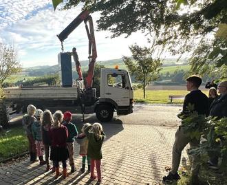 200 kg feinstes Metall gehen auf die Reise: Trotz kurzer Transportstrecke erforderte die Lieferung des schweren Bücherschranks eine logistische Meisterleistung. Vor dem Hof des GogelmoschHauses setzte am Morgen des 21. September vor den staunenden Augen der Kindergartenkinder ein Kranwagen den Prototyp eines hochwertigen Edelstahlschrankes von der G. S. Stolpen ab.