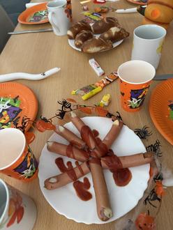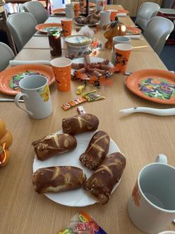 Zum Frühstück wurden thematisch passende Halloween-Köstlichkeiten serviert, die nicht nur gruselig aussahen, sondern auch lecker schmeckten. Begleitet von stimmungsvoller Musik wurde gemeinsam gegessen und gelacht, während die Jugendlichen die verschiedenen Snacks entdeckten.