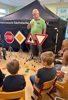 Zusammenfassend konnten die Kinder erste Einblicke von Verhalten im Straßenverkehr, Verkehrszeichen und Sichtbarkeit im Verkehr erhalten. In diesem Sinne möchten sich alle Kinder und Erzieher herzlichst für den informativen Tag mit der Verkehrswacht Pirna bedanken.