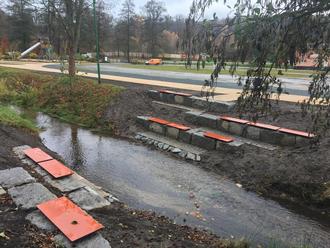 Umgestaltung Marktplatz Dittersbach Die Gestaltung der Bachterrassen auf beiden Seiten des Kalten Baches aus Natursteinen ist abgeschlossen. In Kürze erhalten sie noch Sitzelemente aus Holz und laden dann zum Aufenthalt direkt am Bach ein. Die Pflasterarbeiten des Rundweges sind mit dem Anschluss an die Zufahrt zur Brücke ebenfalls abgeschlossen. Im November erfolgt die Pflanzung von Bäumen, Gehölzen und der Raseneinsaat. Damit ist die Gesamtmaßnahme dann fertig gestellt.