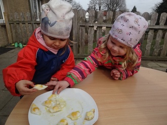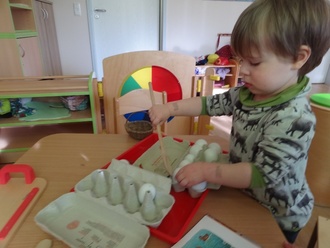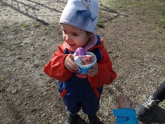 Was bietet sich mehr an, als vor Ostern mit den Kindern ganz viel zum Thema Ei zu machen? Gesagt, getan. Mit tatkräftiger Unterstützung von unseren Eltern und Kolleginnen, hatten wir schnell die passenden Anschauungsobjekte (Kuscheltierhuhn, Bücher, Eier…) parat und es ging los. Wir schauten erst einmal, welche Tiere denn alle Eier legen können. Schnell wussten die Kinder, dass das riesige Ei auf dem Morgenkreisteller vom Vogel Strauss ist und dass aus dem Hühnerei ein kleines Küken schlüpfen kann. Wir versuchten die Eier geschickt mit Löffeln zu balancieren, spielten in unserer Spielküche mit Holzeiern, bemalten Eier aus Pappmaché, gestalteten bunte Eier-Fensterbilder, lasen zusammen das „Ei-Wunder“ und als großes Highlight besuchten wir an einem Freitag die Tagesmama Mandy Gedig aus Wilschdorf. Dort durften wir mit ihr zu den Wachteln, ihre Eier aus dem Stall holen und anschließend zubereiten und verkosten. Ein Erlebnis mit allen Sinnen. Als Abschluss unseres kleinen Ei-Projektes veranstalteten wir kurz vor Ostern noch ein kleines Eier-Frühstück und suchten anschließend fleißig im Garten nach Osternestern.