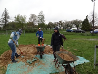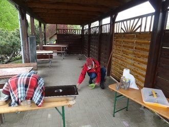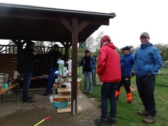 Auch wenn es regnete und stürmte und uns langsam aber sicher die Finger steif wurden von der Kälte, ein paar tapfere Eltern und Erzieherinnen wollten dennoch den 19.04. wie geplant nutzen und ein paar Dinge in unserem Garten schaffen. Unsere Totholzhecke wurden erneuert, gemeinsam schafften wir den restlichen neuen Sand in unseren Sandkasten, der Spielzeugschuppen wurde aufgeräumt, gesäubert und das Spielzeug ausgemistet, repariert und gereinigt. Ein paar weitere unerschrockene Eltern und Erzieherinnen trotzten im Garten dem Regen und verschnitten die Sträucher. Auch wenn wir ein paar Tätigkeiten (streichen/lackieren) aufgrund des Wetters ausfallen lassen mussten, (doch aufgeschoben, ist nicht aufgehoben – ein neuer Termin kommt bald ) so waren alle Helfer am Ende stolz und aßen zufrieden ihre warmen Würstchen oder den Kuchen und erfreuten sich an den sichtbaren Ergebnissen.