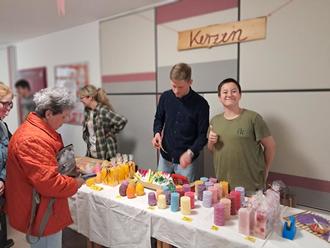 Auch zum ersten Mal konnten kleine Wollschafe gebastelt werden. Und selbstverständlich durften unsere erstmals österlichen/frühlingshaften Kerzen von unserer Schülerfirma Kerzen nicht fehlen. Hier wurde rege gestaunt, gelacht und gekauft.