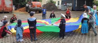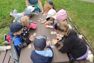 Inzwischen hatte eine gute Fee den Regen vertrieben und nach einer Stärkung mit rotem Kinderwein von Rotkäppchen ging es hinaus über die sieben Berge. Wir fanden den Hochzeitsort vieler Prinzen und Prinzessinnen (Kirche), den Teich vom Butt (Fischer und seine Frau) und suchten Freunde der Biene Maja. (Insekten, Schnecken usw.) Schneebälle der Frau Holle wurden mit dem Schwungtuch in den Himmel geschleudert und das Mauseloch von Däumelinchen aufgestöbert. Ein großes Memorie musste innerhalb von drei Minuten gemeinsam sortiert werden, so hatte es die Stiefmutter von Aschenputtel aufgetragen. Und welches winzige Gemüse brachte noch einmal eine Prinzessin um den Schlaf? (die Erbse) Zuletzt ging es auf Kräutersuche. Was ist alles essbar? Denn Hänsel und Gretel, die sich ja im Wald verirrt hatten, mussten auch essbar Kräuter und Beeren suchen …