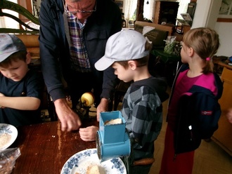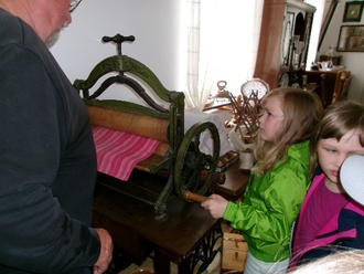 Wir teilten uns in 2 Gruppen auf. Eine Gruppe waren zuerst die „Waschfrauen“, die andere Gruppe hantierte in der Küche mit alten Küchengeräten. Die Kinder rollten Wäsche, damit keine Falten mehr in der Wäsche waren. Es wurden Bohnen geschnippelt, Äpfel geschält, Mandeln gemahlen und getrocknete Semmeln gerieben. Auch eine Kaffeemühle, eine Waage und eine alte Schreibmaschine wurden ausprobiert. Die Kinder merkten, dass mit den alten Küchengeräten die Arbeit in der Küche viel anstrengender war und länger dauert, als heute mit den elektrischen Geräten.
