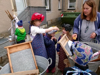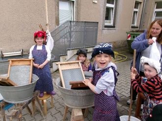 Dann wechselten die Gruppen und die „Waschfrauen“ durften die Küchengeräte ausprobieren und die Küchenfrauen wurden zu Waschfrauen. Die Kinder hatten viel Spaß dabei und hatten am Nachmittag viel ihren Eltern zu erzählen.
