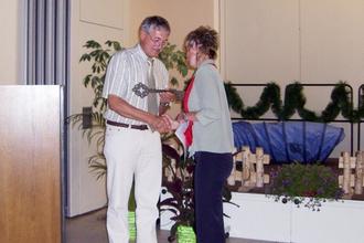 Herr Dr. Salm (Planungsbüro „bauplanconcept“ überreicht Frau Haschke den Schlüssel zum neuen Kindergarten.
