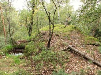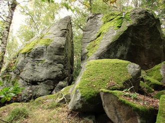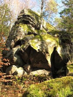 Wenn die Zwergenschmiede erkundet ist, geht man den Waldweg weiter vorbei an markanten Felsen und gelangt dann wieder auf den ausgeschilderten Wanderweg.
