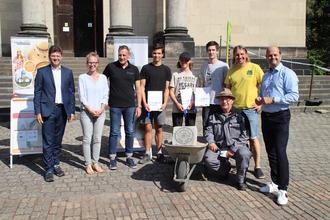 Am 2. September begrüßte Oberbürgermeister Dr. Robert Reck das neue Team des Jugendbauhüttenjahres 2024/2025. Die Jugendlichen absolvieren auf der Einsatzstelle am Mausoleum unter fachlicher Anleitung ihr Freiwilliges Soziales Jahr (FSJ) im Bereich Kultur/Denkmalpflege. Dank dieses Projektes, das mittlerweile in die achte Runde geht, konnten bereits die Freitreppe zum Mausoleumseingang, die Umgangsmauer im Außenbereich, die Grünanlagen und Wege sowie der Springbrunnen denkmalgerecht wiederhergestellt werden. Nun sollen in den nächsten Monaten die bereits begonnen Restaurierungsarbeiten des Mosaikbodens und der Marmorfließen im Innenbereich fortgesetzt werden. Außerdem werden die seit dem 2. Weltkrieg verschütteten Räume im Ostteil des Gebäudes freigelegt.