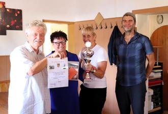 Joachim Ullrich, Vorsitzender des Stadtverbandes der Gartenfreunde, Katrin Grune von der Stadtverwaltung, Bürgermeisterin Jacqueline Lohde und Frank Unger vom Umweltamt (von li.) überreichten den Wanderpokal. Foto: Stadt Dessau-Roßlau