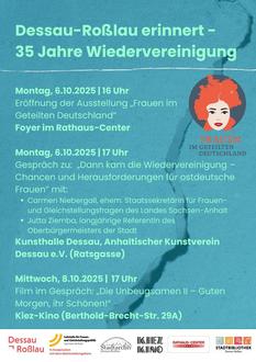 In Anlehnung an die Ausstellung „Frauen im geteilten Deutschland“ wollen wir exemplarisch die Geschichte von zwei Frauen in den Blick nehmen und mit Hilfe deren Erinnerungen Geschichte lebendig werden lassen. Die Veranstaltung findet in Zusammenarbeit mit dem Stadtarchiv, der Stadtbibliothek und der Gleichstellungsbeauftragten der Stadt Dessau-Roßlau statt. Für die freundlichen Unterstützung danken wir dem Anhaltischen Kunstverein Dessau e.V. sehr herzlich.