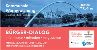 Am Montag, 13.10.2025 um 18 Uhr findet zusätzlich zum Online-Verfahren in der Marienkirche Dessau ein öffentlicher Bürger-Dialog der Stadt Dessau-Roßlau zur Kommunalen Wärmeplanung statt. Alle interessierten Bürgerinnen und Bürger sind herzlich eingeladen, sich hier über die Wärmeplanung zu informieren und die Ergebnisse zu diskutieren. Dafür stehen Bürgermeisterin Jacqueline Lohde sowie Ralf Kähler von der Firma energielenker projects GmbH bereit.
