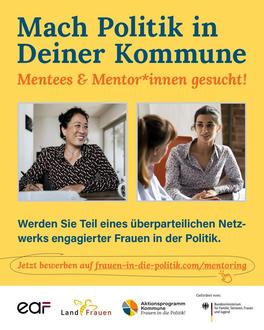 Anfang Oktober hat nun die Bewerbungsphase des Programms begonnen und sowohl interessierte Mentees als auch Mentoren haben die Möglichkeit, sich für dieses kostenfreie Programm online zu bewerben. Das Mentoring-Programm wird im Zeitraum vom Februar bis November 2024 durchgeführt und die Bewerbung ist über eine digitale Plattform (https://www.frauen-in-die-politik.com/mentoring) möglich.