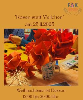 Der Facharbeitskreis Gewalt der Stadt Dessau-Roßlau lädt am 25. November zur Aktion „Rosen statt Veilchen“ auf den Dessauer Weihnachtsmarkt ein. Am Internationalen Tag zur Beendigung der Gewalt gegen Frauen und Mädchen werden in der Weihnachtshütte des Rotary Club Dessau selbst gebastelte orangefarbene Rosenblüten verteilt, um auf das Thema Gewalt gegen Frauen und die Achtung der Menschenrechte aufmerksam zu machen.