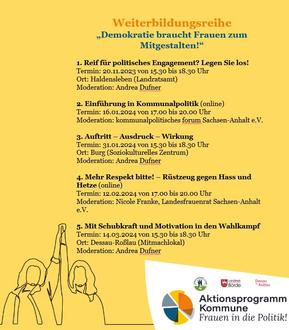 Im Januar 2024 werden gleich zwei Termine der Reihe angeboten. Am Dienstag, dem 16.01. findet von 17.00 bis 20.00 Uhr der Online-Workshop „Einführung in die Kommunalpolitik“ statt. Dafür wurde das kommunalpolitische Forum Sachsen-Anhalt e.V. gewonnen, die einen Einblick in das Rechtsverständnis von Kommunalpolitik gibt und darüber aufklärt, welche Aufgaben die Kommunalverfassung des Landes Sachsen-Anhalt regelt. Außerdem bekommen die Teilnehmenden einen Einblick, wie ein Gesetz zu lesen ist und welche Aufgaben und Pflichten Mandatsträger und -trägerinnen haben. Am Mittwoch, dem 31.01. findet von 15.30 bis 18.30 Uhr in Burg ein Präsenzworkshop zum Thema „Auftritt - Ausdruck – Wirkung“ statt. Die Moderatorin Andrea Dufner widmet sich der Kommunikation und Selbstpräsentation in politischen Alltagssituationen und vermittelt gezielt Techniken für Souveränität, Stimmkraft und Sicherheit. Die Weiterbildungsreihe ist für alle Interessierten kostenfrei zugänglich. Melden Sie sich bei Interesse direkt per E-Mail unter: gleichstellungsbuero@dessau-rosslau.de an.