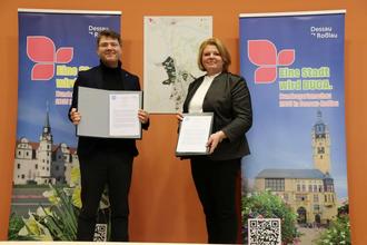 Oberbürgermeister Dr. Robert Reck und Sandra Grüger, Vorsitzende des BUGA CLUB Dessaz-Roßlau e. V. haben eine Kooperationsvereinbarung unterzeichnet.