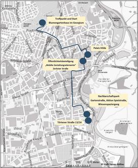 Der Start der Tour erfolgt um 10.00 Uhr am Blumengartenhaus am Schloss Georgium mit einer Führung auf der Baustelle. Danach geht es weiter zum Palais Hilda (10.45 - 11.15 Uhr) in der Zerbster Straße, wo der Eigentümer persönlich für Erläuterungen zur Verfügung steht. Im Anschluss erfolgt ein Abstecher in die Zerbster Straße. Dort wird eine Bürgerbeteiligung zu künftigen Gestaltungselementen durchgeführt (11.20 - 11.30 Uhr). Den Abschluss bilden ein Besuch der Gartenstraße mit Erläuterungen zum künftigen Nachbarschaftspark (11.50 - 12.20 Uhr) und eine Besichtigung der sozialen Begegnungsstätte in der Törtener Straße im Quartier Leipziger Tor (12.25 - 13.00 Uhr).