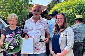 Die stellvertretender Stadtratsvorsitzende Karin Dammann und Referatsleiterin Katrin Kuhnt übergaben diese Ehrung für besonderes ehrenamtliches Engagement. Rainer Süßmann hat sich seit 1995 als Gründungsmitglied des Sport- und Traditionsvereins Meinsdorf e. V. um die Rettung und den nun schon 27 Jahre währenden erfolgreichen Betrieb des Meinsdorfer Schwimmbades verdient gemacht. Auch das durch den Verein wiederbelebte Pfingstgelage, das größte im anhaltischen Fläming, wäre ohne ihn nicht denkbar. Seine Verdienste rund um das Jahrhunderthochwasser 2002, wo er mit seinem Bauunternehmen und viel Engagement agierte, sind unvergessen. Die Stadt Dessau-Roßlau dankt Rainer Süßmann für sein Wirken.