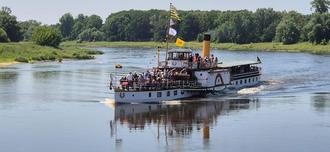 Der Raddampfer „Kaiser Wilhelm“ passiert die Roßlauer Schiffswerft. (Kevin Seltz)