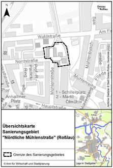 Die Stadt Dessau-Roßlau beabsichtigt die städtebaulichen Sanierungsmaßnahmen im Sanierungsgebiet “Nördliche Mühlenstraße“ in Roßlau, dessen Grenzen in der beiliegenden Übersichtskarte erkennbar sind, im 4. Quartal 2024 zum Abschluss zu bringen und somit die Satzung aufzuheben.