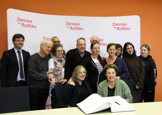 In Anwesenheit von OB Robert Reck trug sich die Familie Goldmann in das Ehrenbuch der Stadt ein. Fotos: Stadt Dessau-Roßlau