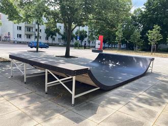 Die sogenannte Minirampe ist etwa 7 Meter lang, 3,75 Meter breit und knapp 1 Meter hoch – und damit gut geeignet für verschiedene Rollsportarten. Sie bleibt bis Mitte September an ihrem Standort.