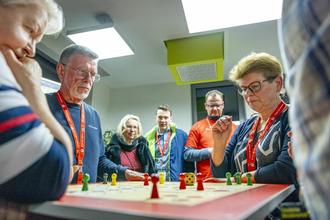 Die Sieger von Mensch ärgere dich nicht. Dritter Platz: Eckehard Böhm (77) aus Naumburg in Sachsen-Anhalt. Peter Rentzsch (68) – hier mit seinem Sandsteinpokal (Wanderpokal) - aus Dohna gewinnt die Deutsche Meisterschaft im "Mensch ärgere dich nicht" in Dohna. Ines Schloms (62) aus Dohna ist Zweitplazierte (v. l. n. r.)