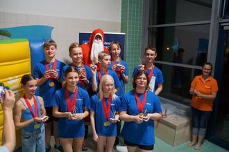 Natürlich ließ es sich der Weihnachtsmann mit seinem Freund, dem Zetti-T-Rex, nicht nehmen und traf rechtzeitig zum Wettkampfbeginn ein. Beide halfen tatkräftig beim Anfeuern und beim Verteilen der vielen Urkunden und Medaillen. Diana Apitzsch von der Volksbank Delitzsch erfreute die Kinder mit einem reichen Gabentisch, jeder durfte ein kleines Weihnachtsgeschenk mit nach Hause nehmen. Der Vorstand und das Trainerteam waren vom Ehrgeiz und Kampfeswillen der Sportler und Sportlerinnen begeistert, viele neue Bestzeiten wurden geschwommen und die VOLKSBANK-Weihnachtspokale fanden ihre neuen Besitzer. Wie immer konnten alle im Anschluss an den Wettkampf im Foyer noch zu Abend essen. Wir möchten uns hiermit für die vielen Helfer am Beckenrand und an der Essenstheke bedanken. Ebenso danken wir den Schwimmvereins-Eltern für den Hol- und Bringedienst im gesamten Vereinsjahr und ein ganz großer Dank geht an die Volksbank Delitzsch, die uns so großzügig unterstützt.