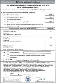 Hinweis: Die öffentliche Bekanntmachung der am zweiten Wahlgang zur Wahl des Bürgermeisters teilnehmenden Wahlvorschläge am 15.06.2025 erscheint ausschließlich im elektronischen Amtsblatt der Gemeinde Doberschütz am 05.06.2025.