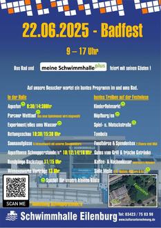 Die Eilenburger Schwimmhalle feiert am Sonntag, dem 22. Juni 2025 von 09:00 Uhr bis 17 Uhr Badfest. Alle Interessierten sind dazu herzlich eingeladen. Ein abwechslungsreiches Programm wartet in und neben der Halle auf die Besucher. Für kleine und große Gäste gibt es eine Spiel- und Matschstraße, eine Rettungsschau, Hüpfburgen, Aquafun, jede Menge Wissenswertes sowie vieles mehr. Auch für die Verköstigung ist mit Grillgut, Kuchen, Eis und Getränken gesorgt.