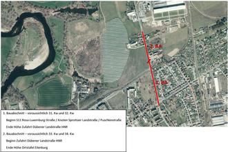 Der Bauablauf erfolgt in zwei Bauabschnitten. Der erste Abschnitt umfasst die S11 Rosa-Luxemburg-Straße /Knoten Sprottaer Landstraße/ Puschkinstraße bis Dübener Landstraße und wird voraussichtlich vom 31. Juli bis 11. August 2023 erneuert. Die Umleitung erfolgt über die Ernst-Mey-Straße. Die Kreuzung Sprottaer Landstraße / Dübener Landstraße / Puschkinstraße ist in diesem Zeitraum voll gesperrt. Eine Zufahrt zur Sprottaer Landstraße ist daher aus Richtung Eilenburg nicht möglich.