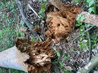 Abgestorbener Baum, der im Mai 2023 gefällt werden musste. Der Stamm war schon so stark zersetzt, dass der Baum nur noch mit einem Zugseil umgelegt werden konnte.