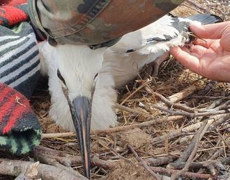 Hoch hinauf über die Dächer ging es für Mitarbeiter des Landschaftspflegeverbandes Nordwestsachsen e. V. am 28.06.2023 mit einer Hebebühne zur Überprüfung der Weißstorchhorste in der Region Nordwestsachsen. Mit einer Decke und mit Ringen ausgestattet näherten sich der Experte Dieter Wend und der Beringer Dietmar Hayder den Storchenkindern. Neben der jährlichen Routineuntersuchung der Storchenhorste auf Standfestigkeit und eingebauten Müll im Nest konnten wieder zahlreiche Jungtiere festgestellt und gezählt werden. Die Großen und Kräftigen von Ihnen bekamen einen kleinen Ring an das Bein, auf dem eine Nummer zu sehen ist. Mithilfe dieser Nummer kann jeder einzelne Storch eindeutig identifiziert werden. Die Decke braucht es nicht zum Kuscheln, sondern um den Storchennachwuchs beim Anbringen der Ringe davor zu schützen, nicht aus dem Nest fliegen zu wollen. Gleichzeitig reduziert es den Stress und erinnert an das schützende Gefühl, wenn die Elterntiere ihre Flügel über den Jungtieren ausbreiten.