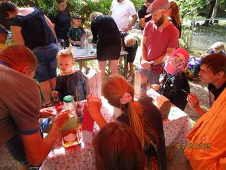 Weiter ging die Party mit Spielen, wie: Schildkötenrennen, Salatkopfkegel, Krötensprung auf dem Trampolin und vielem mehr. Auch der Startschuss für den Bau unseres „Tausend-Fühler-Dorfes“ fiel. Mit Kreativität und Tatendrang bauten Kinder und Eltern gemeinsam erste Häuser, welche demnächst vor der Kita zu besichtigen sind. Zudem organisierte der Elternrat ein üppiges Buffet mit Leckereien und Getränken.