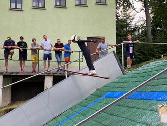 Foto: privat - Trainer Peter Schipke beobachtet einen Trainingssprung von Oscar Müller.