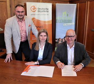 Foto: Stadtverwaltung Eilenburg – (v. l.) Der Regionalleiter Ost der Deutschen GigaNetz GmbH Stefan Heß, Lisa Michalsky (Managerin Regionale Kooperation) sowie Oberbürgermeister Ralf Scheler unterzeichnen die Kooperationsvereinbarung.