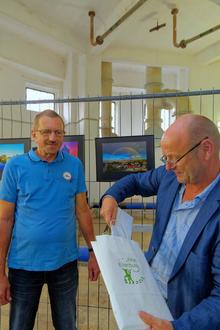 Foto: Kreativ-Netzwerk EB - Der spätere Preisträger des Publikumspreises Olaf Rabe erhält hier für sein Bild „Eilenburg unterm Regenbogen“ den 5. Preis der Jury von Andreas Flegel dem Chef des Eilenburger Geschichts- und Museumsverein e.V. überreicht.