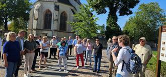Im Anschluss folgte eine Stadtrundfahrt unter Leitung von Frau Trump. Diese begann am Parkplatz Nordring und führte zunächst zur Wasserskianlage, wo die Butzbacher eine kurze Pause einlegten. Ein weiterer Halt wurde am Wasserturm eingelegt, wo Frau Trump Wissenswertes über das Bauwerk und das ECW-Gelände vermittelte. Danach ging es über das historische Rathaus auf den Burgberg. Dort konnten die Gäste die symbolische Zugbrücke überqueren und den Sorbenturm besteigen – bei bestem Spätsommerwetter bot sich ein eindrucksvoller Blick über die Stadt.