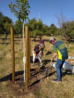 Ein Apfelbaum war besorgt, die Pflanzstätte professionell vorbereitet und alle erforderlichen Utensilien lagen bereit. Gemeinsam wurde ein Hochstamm der Sorte „Landsberger Renette“ gepflanzt. Es war sehr interessant zu erfahren, was dabei alles zu beachten ist. Natürlich ließen es sich die Mitglieder des Stadtseniorenrates nicht nehmen, aktiv mitzuarbeiten. Dieser Baum hat die Nr. 121 auf der Streuobstwiese Hainichen.