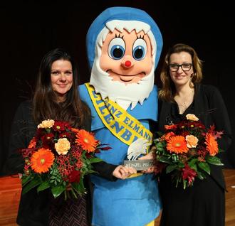 Foto: Stadtverwaltung Eilenburg - Heinzel-Preis-Träger Dagmar Seidel (l.) und Sabine Meier (r.) mit Stadtmaskottchen Heinz Elmann®.