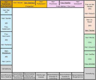 Neben dem Oberbürgermeister sitzen in der Regel die Fachbereichsleiter (Amtsleitung), die bei Bedarf Auskünfte geben.