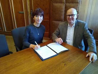 Foto: Lena Freyer (l.) unterschreibt ihren Arbeitsvertrag bei Oberbürgermeister Ralf Scheler (r.)