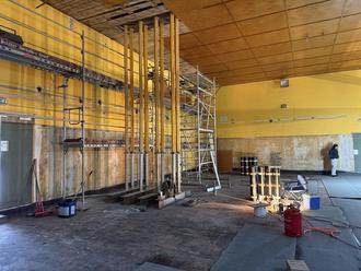 In den Geräteräumen wurde der Estrich eingebaut. Die Rohbauarbeiten im Hallenbereich stehen kurz vor dem Abschluss, sodass die baulichen Grundlagen der sanierten Turnhalle weitgehend fertiggestellt sind. Ein wesentlicher Schwerpunkt lag zuletzt auf der nachträglichen Herstellung neuer Fensteröffnungen in den bestehenden Außenwänden. Dafür mussten entsprechende Wandbereiche durch Wandschneidearbeiten fachgerecht geöffnet werden. Um während dieser Arbeiten die statische Sicherheit des darüberliegenden Geschosses zu gewährleisten, wurden die tragenden Stahl-Deckenträger zeitweise mit Stützen abgefangen.