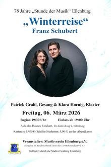 Am Freitag, dem 06. März findet es das nächste Konzert der Reihe „Stunde der Musik“ statt. Der Leipziger Sänger Patrick Grahl, einer der gefragtesten Tenöre seiner Generation, präsentiert Franz Schuberts „Winterreise“, ein Liederzyklus nach Gedichten von Wilhelm Müller. Am Flügel begleitet die Berliner Pianistin Klara Hornig. Beginn des Konzertes in der Aula des Hauses Rinckart in Eilenburg ist 19.30 Uhr, Einlass ab 19 Uhr. Karten zu 15,-€ bzw. 5,-€ für Schüler und Studenten gibt es an der Abendkasse. Ein wichtiger Hinweis: Bei diesem Konzert wird es keine Pause geben.