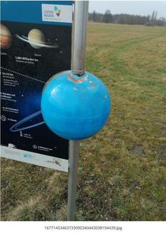 Immer wieder werden unter anderem touristische Schilder in Eilenburg sinnlos mit Schmierereien bedeckt. Auch der Planetenwanderweg wird regelmäßig Opfer solcher unschönen Verzierungen. Dem nicht genug, gab es aktuell eine massive Beschädigung der Metallkugel an der Lehrtafel des Uranus. Diese Kugeln zeigen an jeder Informationstafel des Planetenwanderweges das Aussehen des jeweiligen Planeten. Da die touristische Beschilderung in kommunaler Hand liegt, muss diese auch für den Ersatz Rechnung tragen. Was wiederum bedeutet, dass der Steuerzahler am Ende für den Vandalismus aufkommen muss.