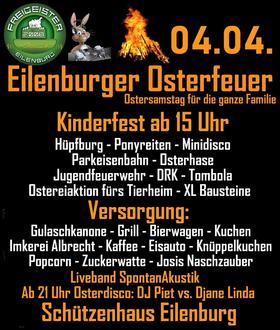 Traditionell entzünden die Freigeister am Ostersamstag das Osterfeuer in der Kastanienallee. Dazu findet ein großes Familienfest statt. Der Eintritt ist wie gewohnt frei und für Sitzmöglichkeiten, Versorgung, Parkplatz sowie ein umfangreiches Programm ist gesorgt. Die Tombola ist auch dieses Jahr wieder mit tollen Preisen aus der Region gefüllt. Neben einem Laufrad von Fahrrad Hammer, gibt es z.B. eine Familientageskarte für den Zoo Leipzig, Tickets für den FC Eilenburg und Gutscheine sowie Sachpreise diverser Eilenburger Unternehmen und Privatpersonen. Alle Preise werden bei Facebook und Instagram unter Freigeister Eilenburg veröffentlicht. Am 04.04. heißt es wieder Freunde treffen, glückliche Kinder und Gemütlichkeit am großen Feuer. Durch Kaminholz Max ist für ausreichend Holz gesorgt. Wir danken an dieser Stelle der Jugendfeuerwehr und dem Jugendrotkreuz sowie allen Sponsoren und Teilnehmern für die Unterstützung.