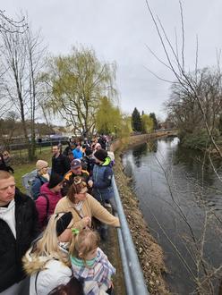 Besuchermagnet war neben dem Frühlingsmarkt das beliebte Entenrennen. Dieses Jahr durften die 1000 Gummienten wieder auf dem Mühlgraben um die Wette schwimmen. Lose konnten im Vorfeld über den Online-Ticketverkauf des städtischen Eigenbetriebes Kulturunternehmung Eilenburg oder auch in der Tourist-Information erworben werden. Alle Lose waren schon ein paar Tage vor der Veranstaltung vergriffen. Zum Eilenburger Gezwitscher wurden die Enten pünktlich um 10:30 Uhr vom Oberbürgermeister Ralf Scheler, Jens Lieske vom Autohaus Lieske und weiteren Helfern ins Wasser geworfen. Nach ca. 25 Minuten erreichte die Siegerente mit der Nummer 767 das Ziel am Maxim-Gorki-Platz.